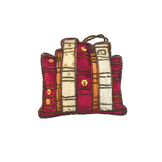 This lovely maroon velvet Decoration has been handmade using traditional techniques. Depicting a row of interesting books on the front and 'Bodleian Libraries' on the back.