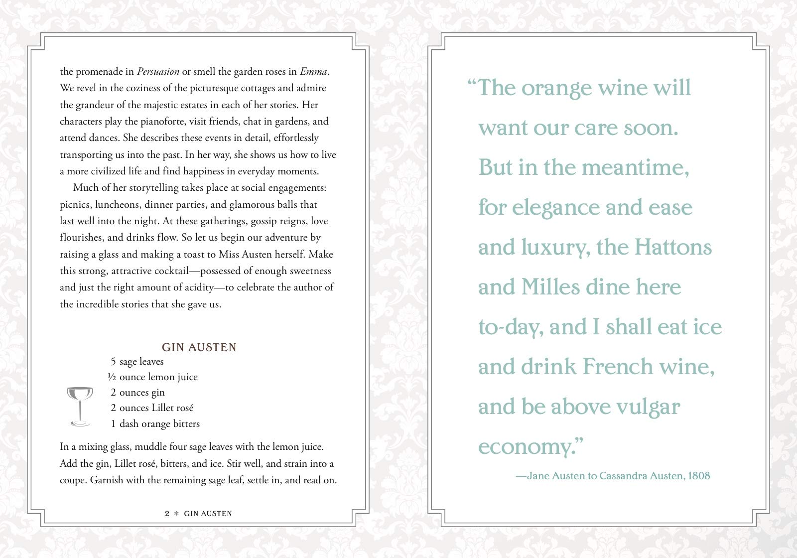 Jane Austen captured the fancies and foibles of Regency England, and every delightful page of this book celebrates the picnics, luncheons, dinner parties, and glamorous balls of Austen’s world. At these social engagements, gossip reigned, love flourished, and drinks flowed. Discover a world of cobblers, crustas, flips, punches, shrubs, slings, sours and toddies, with recipes that evoke the past but suit today’s tastes. Raise your glass to Sense and Sensibility with a Brandon Old-Fashioned, Elinorange Blossom, Hot Barton Rum or Just a Dashwood. Toast Pride and Prejudice with a Cousin Collins, Fizzy Miss Lizzie, Gin & Bennet or Salt & Pemberley. Brimming with enlightening quotes from the novels and Austen’s letters, and featuring beautiful photographs and period design, this is a must for any devoted Janeite.