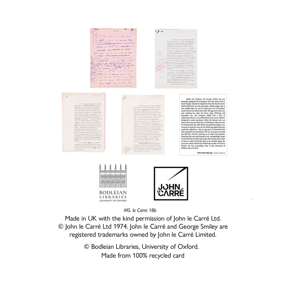 A set of 10 postcards showcasing John le Carré’s novel, Tinker Tailor Solder Spy, from page to print. Explore handwritten drafts, amended print pages and a published passage from the book.