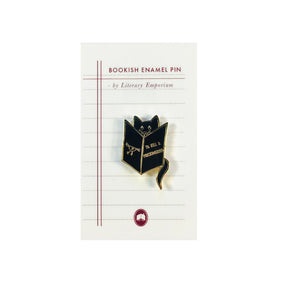 Made from black hard enamel with a gold coloured outline this pin badge features a reading cat design.